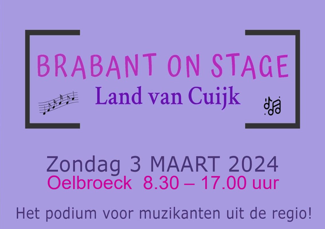 Op zondag 3 maart 2024 zal in Sint Anthonis de eerste editie plaatsvinden van Brabant On Stage - Land van Cuijk, onder auspiciën van de Brabantse Bond van Muziekverenigingen. Op deze dag wordt aan muzikanten in alle leeftijdscategorieën en op elk niveau een podium geboden om hun kwaliteiten te laten horen en zien. Opvallende deelnemers kunnen een Golden Ticket verdienen voor de BOS finale in Eindhoven.