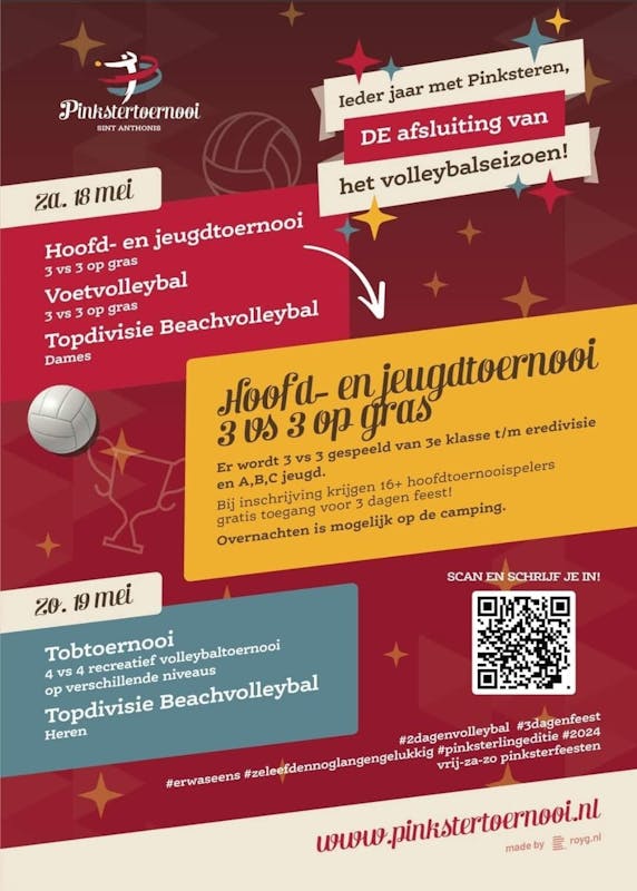 Het Pinkstertoernooi in het Noord-Brabantse dorp Sint Anthonis, wordt dit jaar voor de 66ste maal georganiseerd.. Zoals de naam van het toernooi al doet vermoeden zal ook dit jaar het pinksterweekend van 17 t/m 19 mei 2024, in het teken staan van topvolleybal en entertainment.