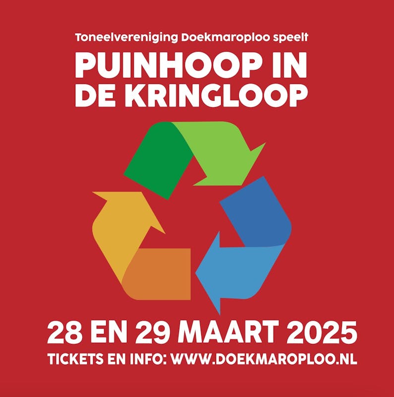 Op vrijdag 28 en zaterdag 29 maart brengt Doekmaroploo in De Oude Heerlijkheid ‘Puinhoop in de kringloop’ (aanvang telkens 20.00 uur, zaal open 19.30 uur). Op zondag 9 maart is er van 10.30 tot 11.30 uur een voorverkoop van toegangskaarten in Koffiehuus Ons Moe, Grotestraat 10a in Oploo. Vanaf 10 maart zijn tickets online te koop via www.doekmaroploo.nl. In de voorverkoop kost een kaart 10 euro (contant en online), aan de dagkassa 12 euro. Let wel: vol = vol! Zie ook www.doekmaroploo.nl