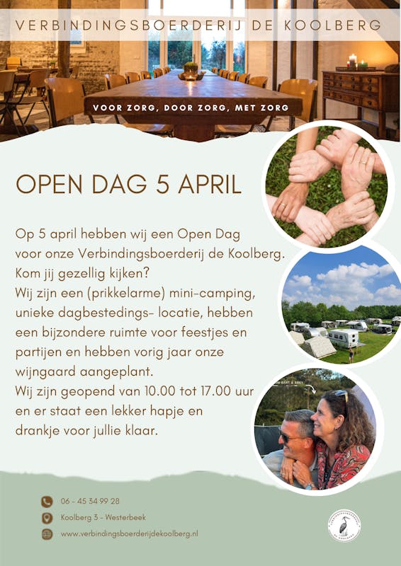 Op 5 april 2025 openen wij de deuren van onze locatie voor iedereen die nieuwsgierig is naar onze camping, dagbestedingsmogelijkheden of de Ruimte die we verhuren. Kom langs om te ontdekken wat wij te bieden hebben en hoe wij samen werken aan verbinding, rust en groei.