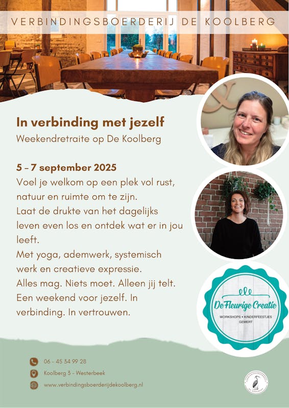 Tijdens dit weekend nemen we je mee op een avontuur naar binnen. Door middel van diverse activiteiten, zoals yoga, creatieve expressie, mindful movement, ademwerk en systemisch werk, krijg je de ruimte om te vertragen, te reflecteren en te ervaren wat er diep van binnen leeft. Kom in verbinding met jezelf, laat los wat niet meer dient en ontdek nieuwe inzichten die je verder kunnen helpen in je persoonlijke groei.