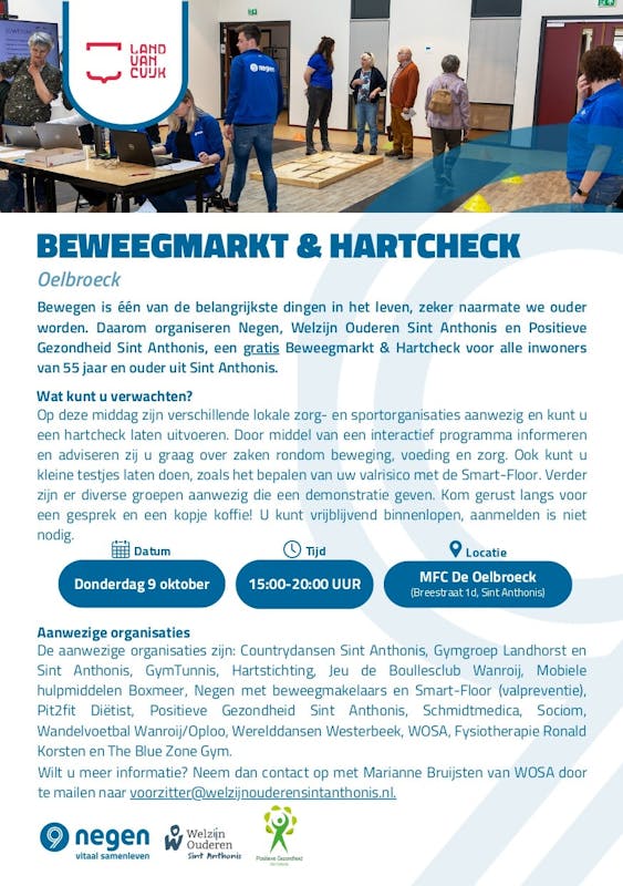 Bewegen is één van de belangrijkste dingen in het leven, zeker naarmate we ouder worden. Daarom organiseren Negen, Welzijn Ouderen Sint Anthonis en Positieve Gezondheid Sint Anthonis, een gratis Beweegmarkt & Hartcheck voor alle inwoners van 55 jaar en ouder uit Sint Anthonis. Op deze middag zijn verschillende lokale zorg- en sportorganisaties aanwezig en kunt u een hartcheck laten uitvoeren. Door middel van een interactief programma informeren en adviseren zij u graag over zaken rondom beweging, voeding en zorg. Ook kunt u kleine testjes laten doen, zoals het bepalen van uw valrisico met de Smart-Floor. Verder zijn er diverse groepen aanwezig die een demonstratie geven. Kom gerust langs voor een gesprek en een kopje koffie! U kunt vrijblijvend binnenlopen, aanmelden is niet nodig.