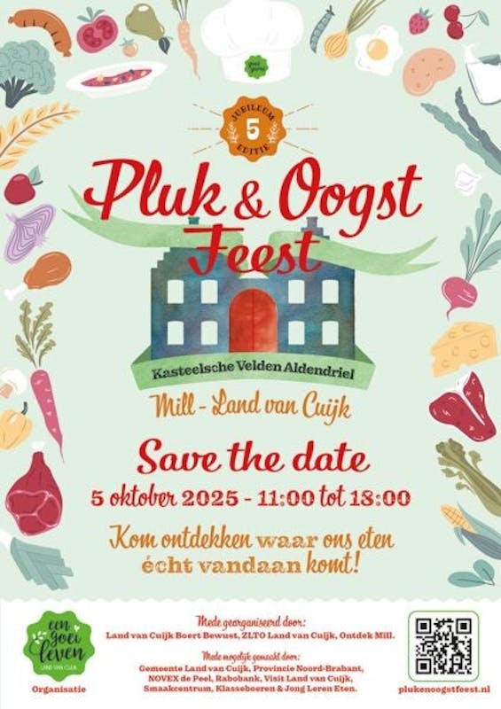 Op zondag 5 oktober 2025 vindt het Pluk & Oogstfeest plaats op een nieuwe, centrale locatie: Aldendrielpark, Kasteel Aldendriel en de omliggende Kasteelsche velden in Mill. Dit unieke evenement brengt natuur, food en Brabantse gastvrijheid samen in een feestelijke setting. Het Pluk & Oogstfeest is dé plek waar boeren, voedselmakers en consumenten elkaar ontmoeten en samen genieten van alles wat het Land van Cuijk te bieden heeft.