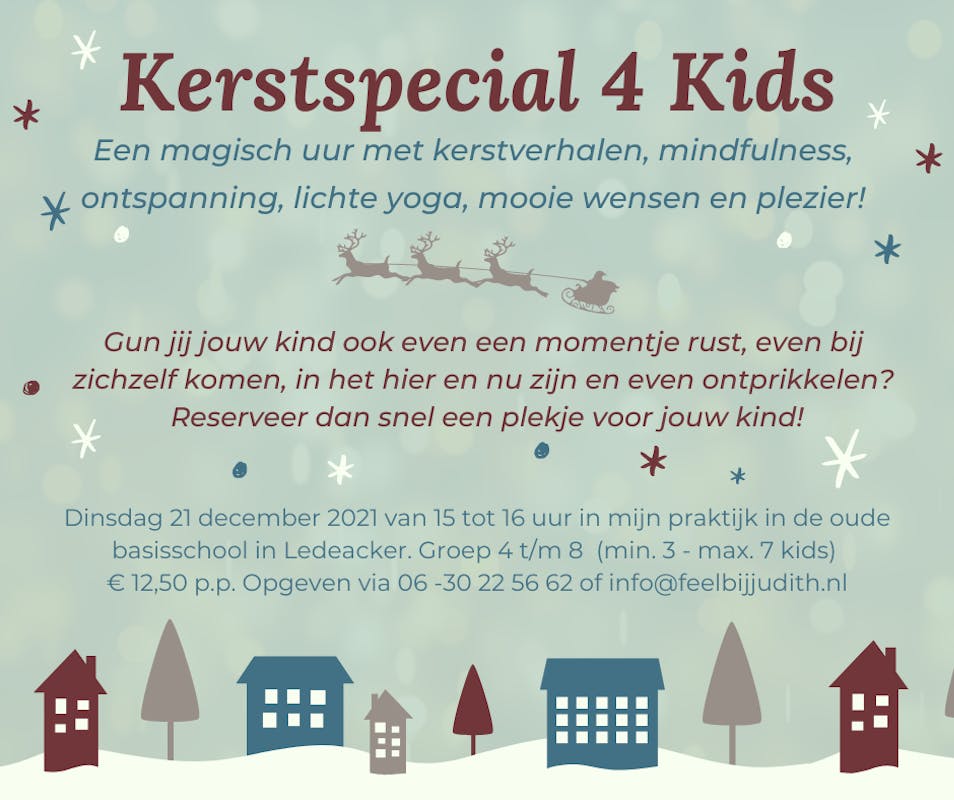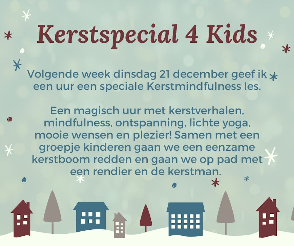 Dinsdag 21 december geef ik een speciale Kerstmindfulness les voor kinderen. Een magisch uur met kerstverhalen, mindfulness, ontspanning, lichte yoga, mooie wensen en plezier! Samen met een groepje kinderen gaan we een eenzame kerstboom redden en gaan we op pad met een rendier en de kerstman.