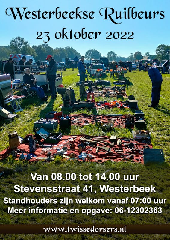 Op zondag 23 oktober wordt er door De Twisse Dorsers voor de tweede keer de Westerbeekse Ruilbeurs georganiseerd. Op deze rommelmarkt is van alles te koop, van complete tractoren tot de kleinste onderdelen. Denk hierbij aan: Tractoren, brommers, onderdelen, gereedschappen, boeken, oude machines, zinken wasteilen, miniaturen, en nog veel meer!