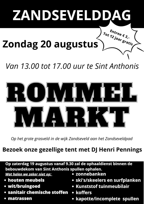 Op zondag 20 augustus zal de 44e Zandsevelddag gehouden worden. Op zaterdag de 19e zal er door de straten van Sinttunnis de (nog bruikbare) spullen opgehaald gaan worden.  De verkoop start om 13.00 uur tot 17.00 uur. voor informatie per mail  of bel 06-40659800