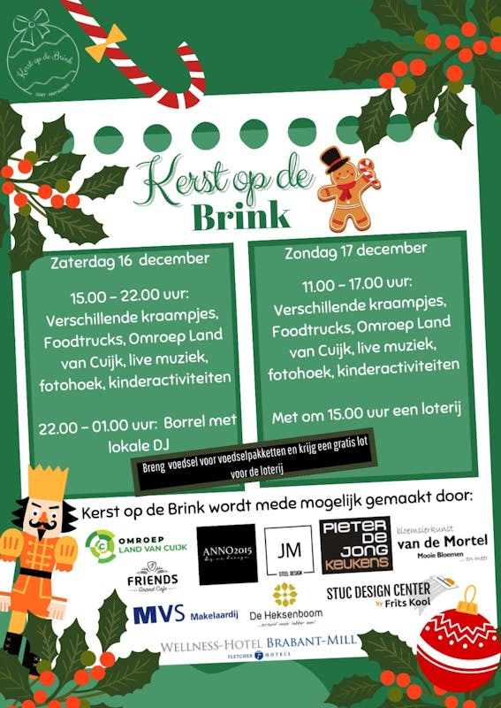 Kerst en goede doelen zijn onlosmakelijk met elkaar verbonden. Ook wij willen graag een goed doel steunen. Wij willen namelijk zoveel mogelijk voedsel inzamelen voor de voedselbank, zodat zij mooie voedselpakketten kunnen aanbieden rond de Kersttijd. Dus kom op 16 en/of 17 december naar Kerst op de Brink en lever voedsel in bij de organisatie, dan krijg je in ruil hiervoor een lootje voor de loterij van zondag 17 december (om 15:00 uur) en kun je prachtige prijzen winnen.