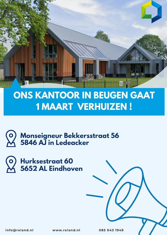 Het kantoor van Reland zat tot voorheen op een mooie locatie in het centrum Beugen en in Eindhoven. Maar omdat het kantoor in Beugen te klein werd, is er gezocht naar een nieuwe locatie. Het pand in Beugen wordt binnenkort verbouwd naar appartementen zoals onlangs was te lezen in De Gelderlander. Het kantoor in Eindhoven blijft gewoon open.