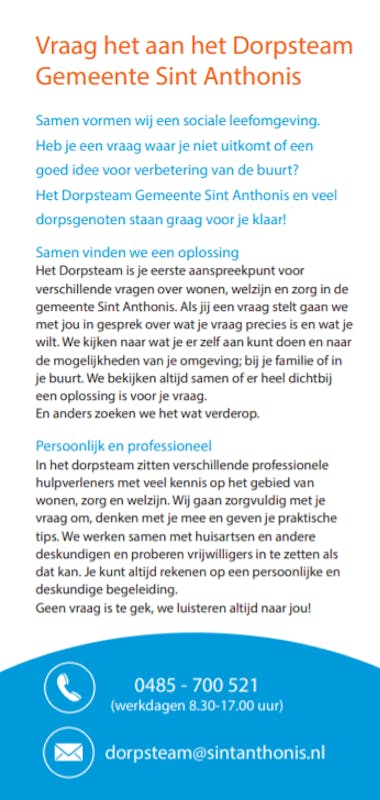 Samen vormen wij een sociale leefomgeving. Heb je een vraag waar je niet uitkomt of een goed idee voor verbetering van de buurt? Het Dorpsteam Gemeente Sint Anthonis en veel dorpsgenoten staan graag voor je klaar!