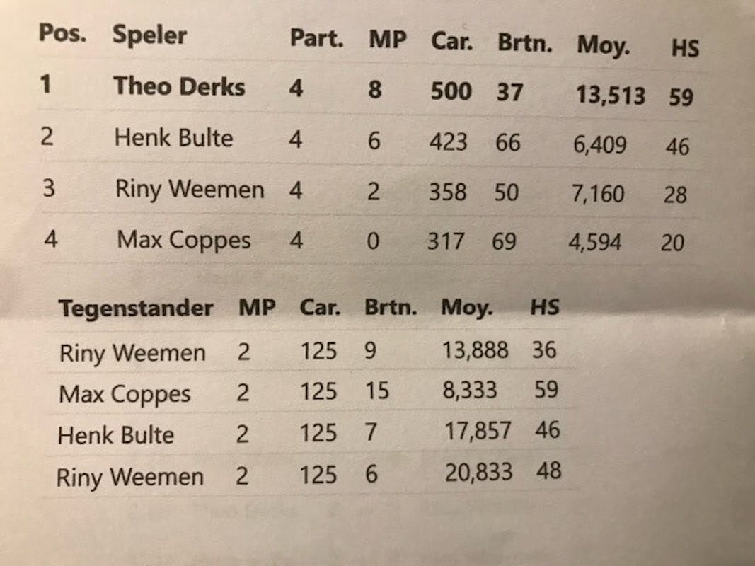 Theo, lid van biljartclub ‘t Zwaantje uit Rijkevoort, is daar eerste geworden met een gemiddelde van 13.51.