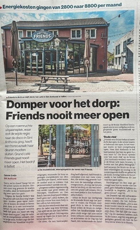 "Op een roemruchte uitgaansplek, waar ooit de wijde regio naar de disco inn Sint Anthonis ging, heeft een horecazaak haar deuren moeten sluiten. Grand café Friends gaat nooit meer open. Het bedrijf is failliet"