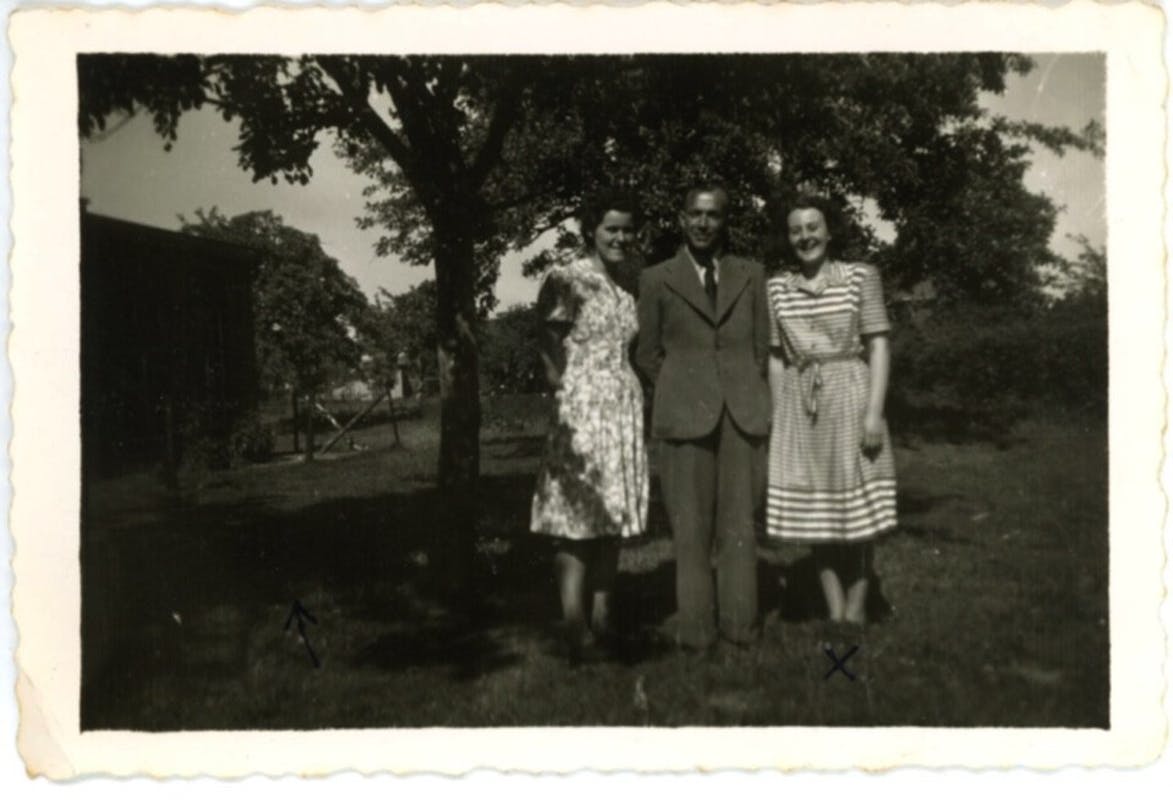 Riek van Sambeek en dhr en mevrouw van Kilsdonk. bij de kippenstal en links het eerste graf van Evans.