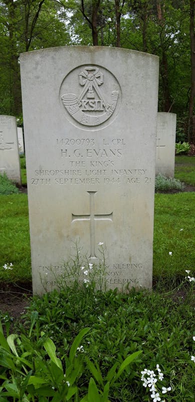 Wat niet geheel duidelijk is,? Wat gebeurde er op 27 september 1944 met Lance Corporal Henry, Godfrey Evans. Naar verluid, zou hij gezeten of gestaan hebben bij een Engelse carrier, nabij de hoek Kemkensbos / Noordkant. (Peter Zuidstraat) Een enkele Duitse granaat slaat in en Evans sterft ter plekke.