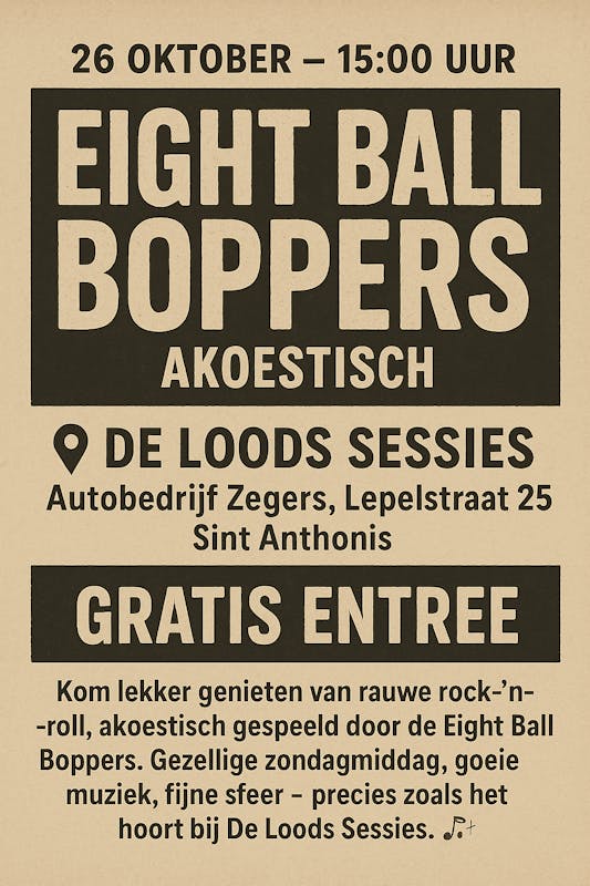 Kom lekker genieten van rauwe rock-βn-roll, akoestisch gespeeld door de Eight Ball Boppers. Gezellige zondagmiddag, goeie muziek, fijne sfeer β precies zoals het hoort bij De Loods Sessies. πΆβ¨Β