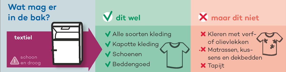 Breng kleding, die jij niet meer gebruikt, weg naar een textielcontainer. Kleding, die nog in orde is, wordt geselecteerd en kan worden hergebruikt. Hiermee kun je een ander dus nog blij maken! Wist je dat ook kleding, die niet meer door een ander gedragen kan worden, in de textielcontainer mag worden gedaan? De materialen kunnen worden gerecycled, zodat zo min mogelijk van de grondstoffen verloren gaat.