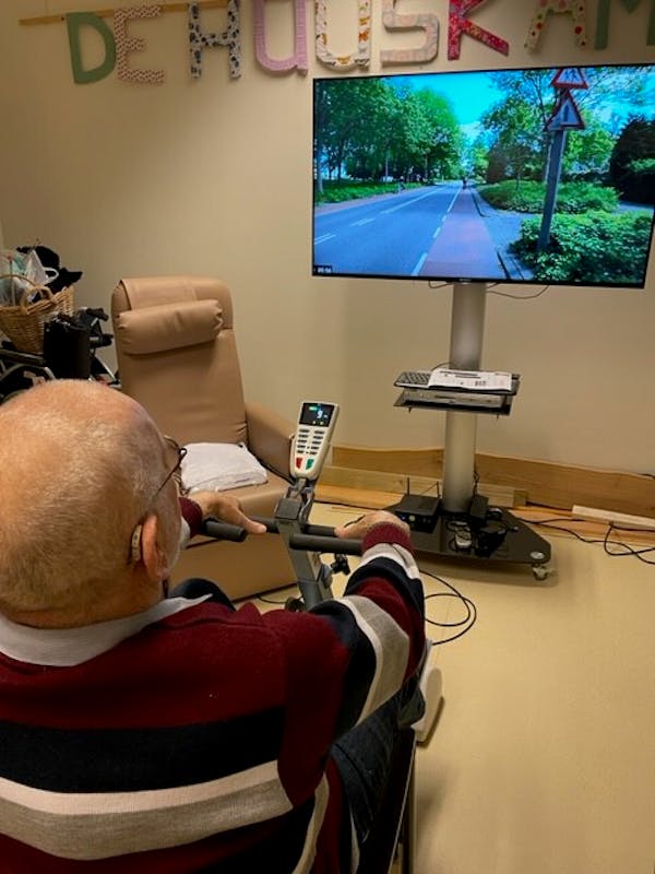 De gasten zijn erg enthousiast over deze Silverfit Mile fiets. De fiets wordt elke dag gebruikt en de gasten vinden het virtuele fietsen geweldig. Ze kunnen zelf het dorp of land kiezen waar ze willen gaan fietsen. In het begin werd thuis verteld dat ze gefietst hadden in Barcelona. Dit riep in het begin wel vragen op bij familieleden. Er wordt ook in groepjes met elkaar gefietst (we hebben ook een vloerfiets erbij geplaatst) wat gesprekstof brengt en saamhorigheid. Bewegen gaat zoveel makkelijker als je bewegende beelden ziet en met elkaar in gesprek kunt gaan over wat er allemaal te zien is. Doordat de fiets in Oelbroeck staat waar mensen elkaar kunnen ontmoeten, hopen we dat ouderen uit het dorp gebruik gaan maken van deze virtuele fiets, en dat er op deze manier een ontmoetingsplaats ontstaat voor de ouderen uit het dorp.”