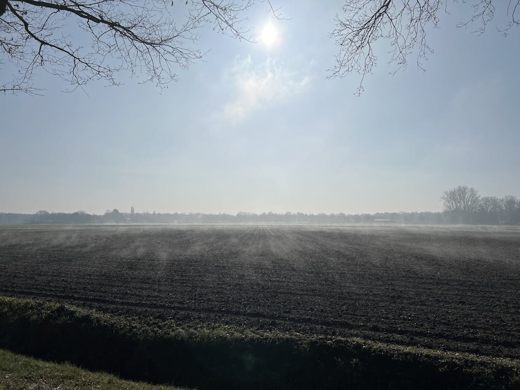 Een akkerlandschap in de ochtendzon, met nevel boven de bewerkte grond. Silhouetten van bomen en het dorp tekenen zich af, terwijl de zon de lentewarmte aankondigt.