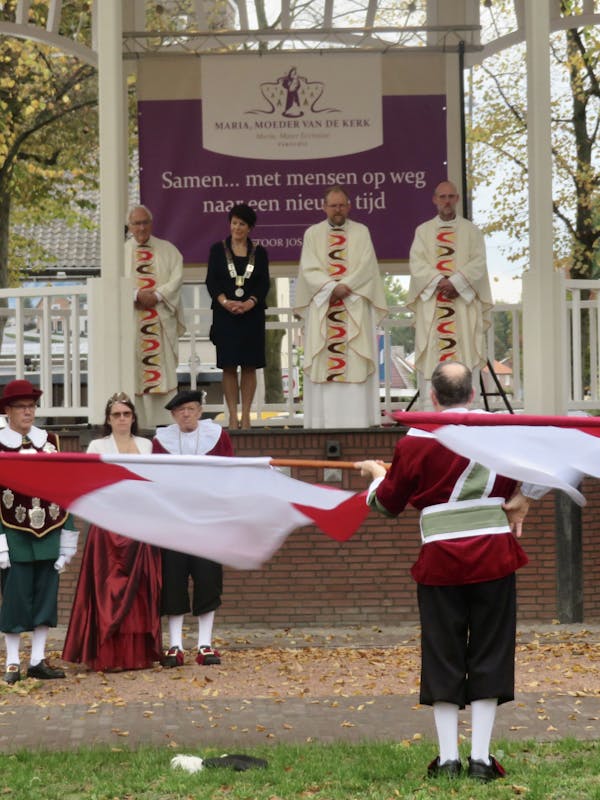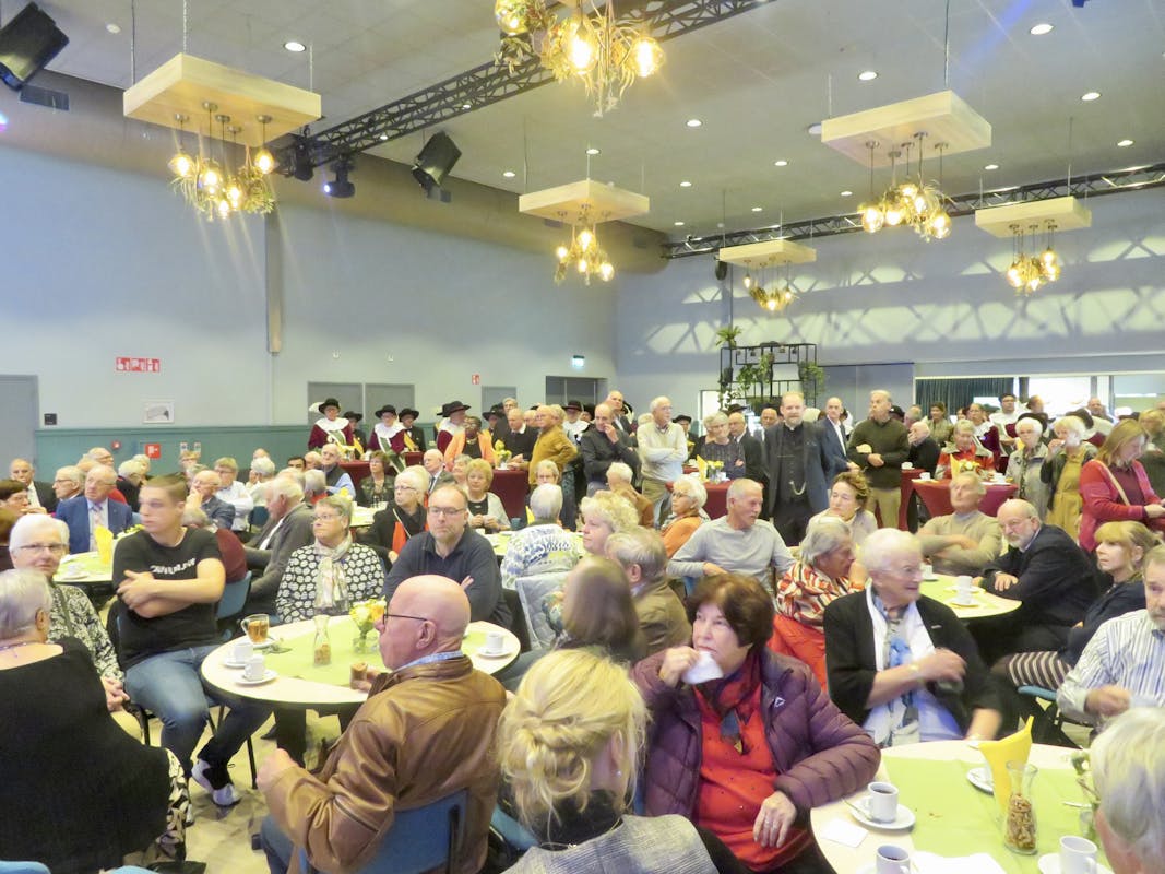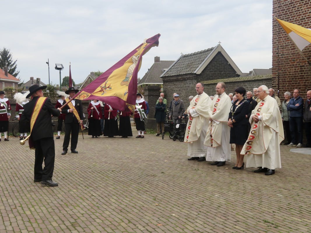 Na een feestelijke en zeer druk bezochte viering in onze dorpskerk werden de celebranten en locoburgemeester overvendeld en volgde een vendelgroet en serenade door bazuinblazers op de Brink.