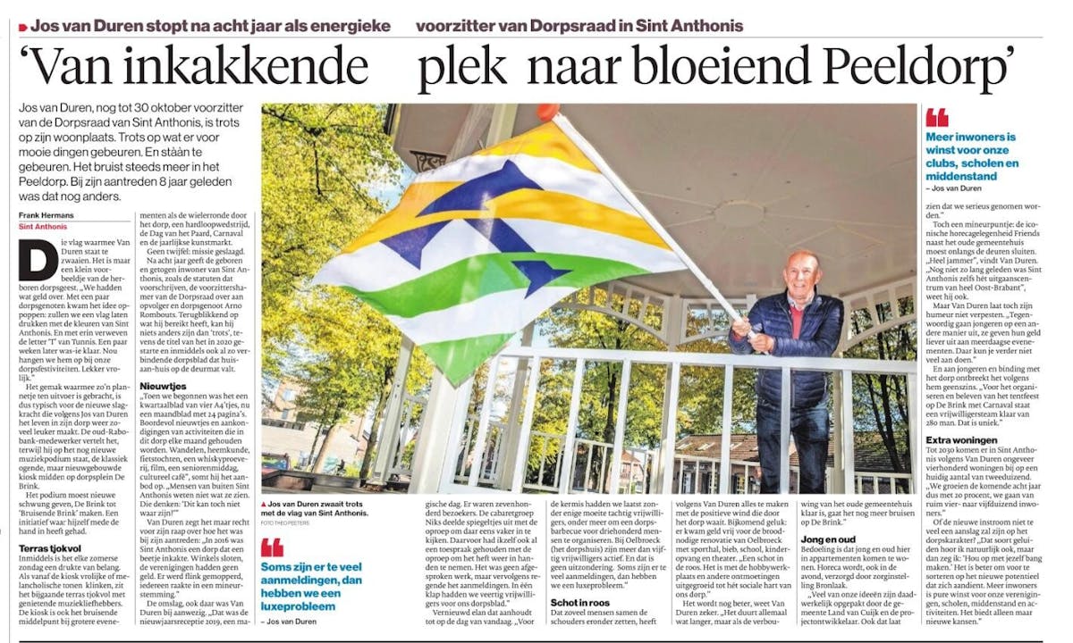 Jos van Duren, nog tot 30 oktober voorzitter van de Dorpsraad van Sint Anthonis, is trots op zijn woonplaats. Trots op wat er voor mooie dingen gebeuren, en stáán te gebeuren. Het bruist weer steeds meer in het Peeldorp. Bij zijn aantreden 8 jaar geleden was dat nog anders.