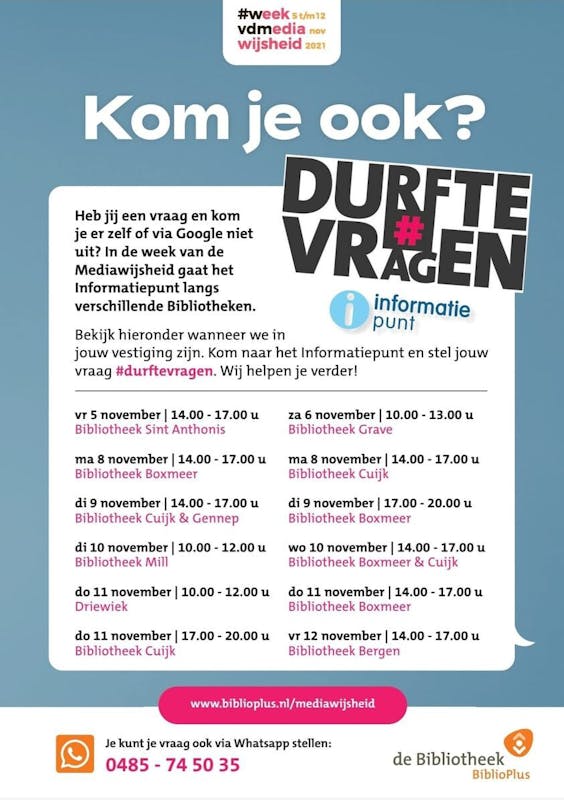 Het Informatiepunt van BiblioPlus gaat op tour in de week van de Mediawijsheid. Van 5 november t/m 12 november staan onze informatiespecialisten niet alleen in de bibliotheken Boxmeer en Cuijk, maar ook als pop-up Informatiepunt in Grave, Sint Anthonis, Gennep, Mill en Bergen! Data en tijden staan op onze posters en op de website: www.biblioplus.nl/ip