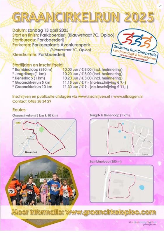 Heb je je hardloopschoenen al gestrikt? De inschrijving voor de 7e editie van de Graancirkelrun Oploo is geopend! Het regionale hardloopevenement, dat op zondag 13 april wordt gehouden, heeft bij alle categorieën een vernieuwd parcours. Bovendien is de start- en finish verplaatst naar het Avonturenpark van de stichting Graancirkel.