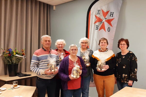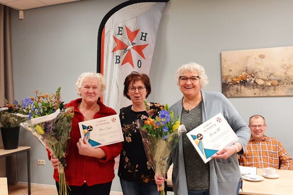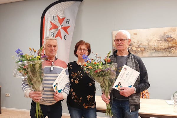 Tijdens de vergadering werden bijzondere leden gehuldigd: Yonta Meijer en Ria van Mil kregen bloemen voor hun inzet, bij de evenementencommissie. Jo Hendriks is 35 jaar lid, Marjo Esser en Ria van Mil zijn 45 jaar lid en Pieter Verstraaten en Cor van Zutphen zijn zelfs 50 jaar lid. Marjo, Ria, Pieter en Cor kregen een certificaat, ze hadden de cursus EHBDD (Eerste Hulp Bij Drank & Drugs) succesvol afgerond. Verder werden de LOTUS-leden (Pieter Verstraaten, Marjo Esser, Rikie Litjes, Ria van Mil en Mattie Westerveld) door de voorzitter bedankt voor hun inzet gedurende het hele jaar. Gefeliciteerd allemaal.