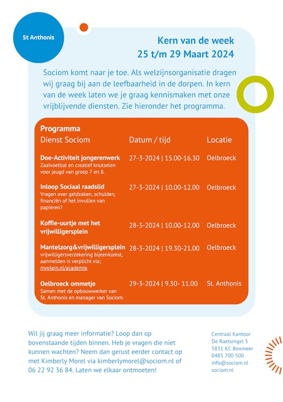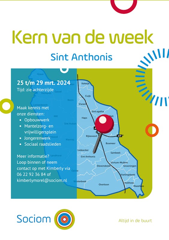 In de kern van de week zal Sociom aansluiten bij verschillende activiteiten, om de inwoners van St. Anthonis kennis te laten maken met onze diensten.