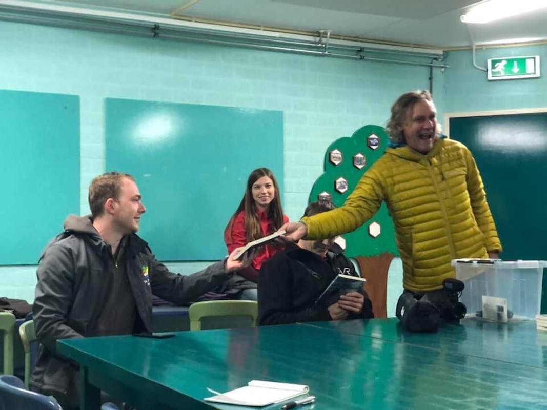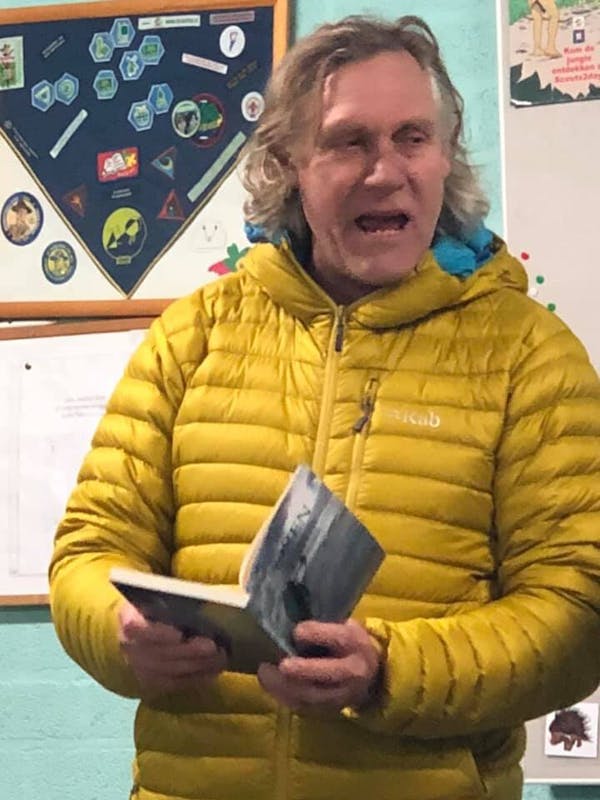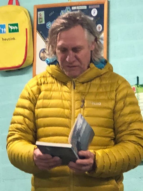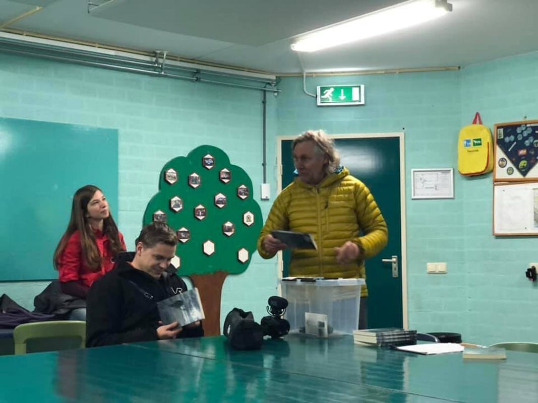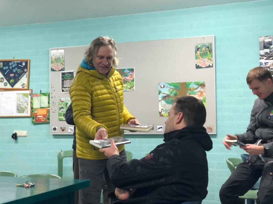 En als blijk van waardering ontvangen de zeven SKB sport klim begeleiders I.o. Het prachtige gesigneerde boek Sporen van Berggeit Pierre kado. Echter niet nadat de schrijver een stuk uit zijn eigen boek voorgelezen heeft.