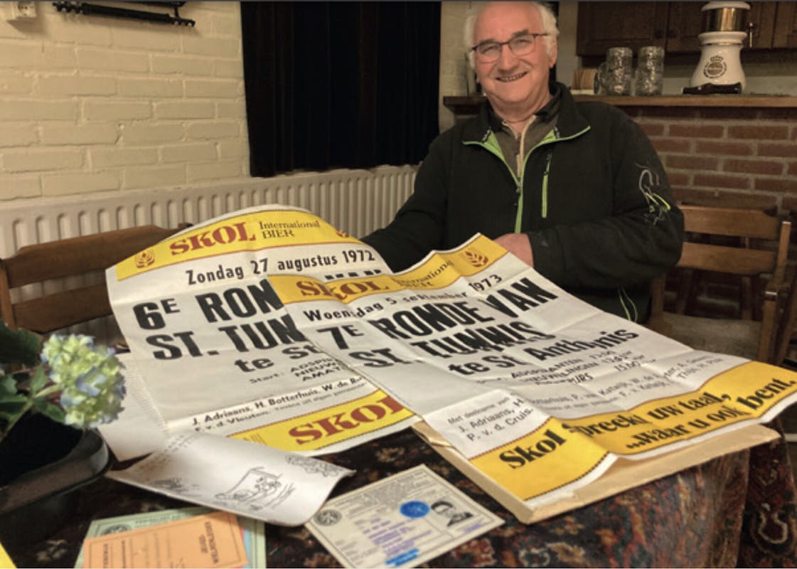 Gerrit (74) zit in de startblokken voor het gesprek. De posters waarmee wedstrijden werden aangekondigd, liggen voor hem op tafel. In zijn hoofd zitten veel herinneringen gedetailleerd opgeslagen. Wielrennen was en is zijn passie. “Wanneer de eerste wielerwedstrijd in Sint Tunnis was? In 1956, die ronde werd gehouden op het Rondveld. Weet je wie toen de winnaar was? Peter Post”, somt Gerrit op. “In de periode 1967 tot 1975 is de wielerwedstrijd negen keer georganiseerd. Zelf heb ik hem één keer gereden en meerdere keren mee georganiseerd. Was een prachtige tijd. Ook een kanjer als Henk Lubberding heeft hier nog gefietst.”