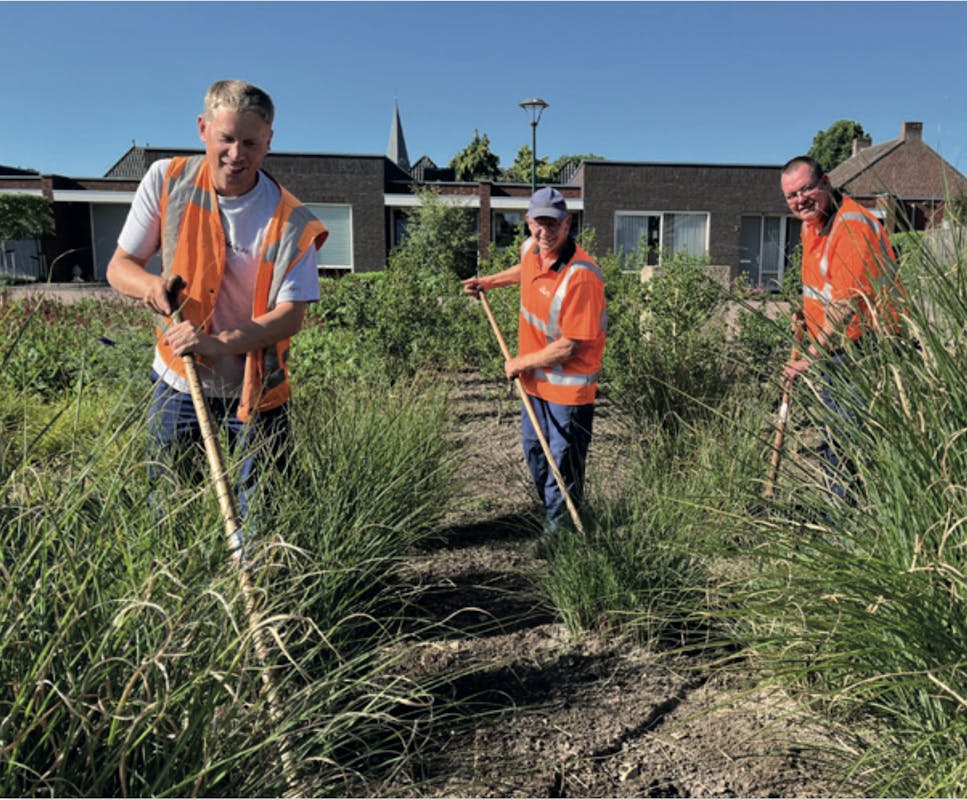 Bij De Sprenkel vegen Dave Vloet (46) uit Sint Anthonis, Frank van Beers (52) uit Vianen en de in Bergen wonende Wim Laarakker (62) het zweet van hun voorhoofd. Het is warm. “Je zult ons wel gemakkelijk gevonden hebben”, zegt Frank. “Je hoeft maar op het geluid van onze ‘razende schoeffels’ af te gaan, haha.” Ze lachen alle drie. De toon is gezet. Het trio maakt deel uit van een groep van zo’n zeven IBN-medewerkers die vrijwel dagelijks werkt in de plantsoenen in Sint Anthonis, Oploo en Ledeacker. Het IBN is een sociaal ontwikkelbedrijf voor mensen met een achterstand tot de arbeidsmarkt. Wim is oud-akkerbouwer en het aanspreekpunt binnen de groep. Frank heeft 30 jaar gewerkt als shovel- en kraanmachinist. Alleen Dave heeft van huis uit een tuindersopleiding gedaan. “Ik ben van ons drieën ook de enige die destijds nog een strenge keuring heeft ondergaan om toegelaten te kunnen worden tot het IBN”, weet Dave.