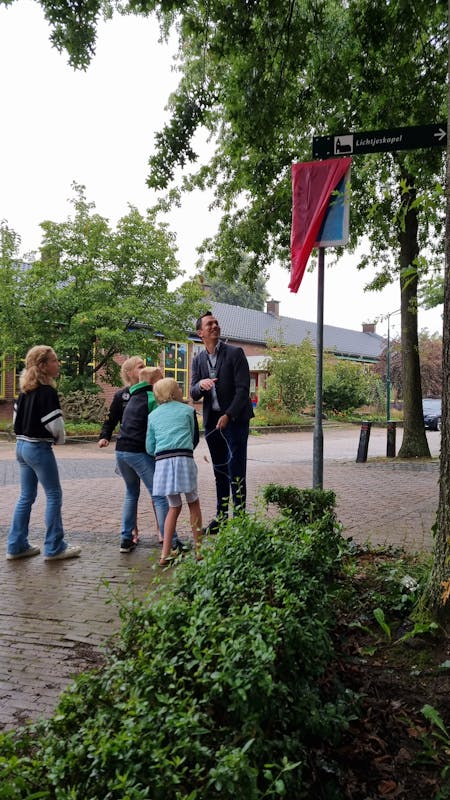 De leerlingenraad van de Antoniusschool in Maashees onthult samen met wethouder Sölez hun zelf ontworpen verkeersbord om de passanten te wijzen op hun snelheid.