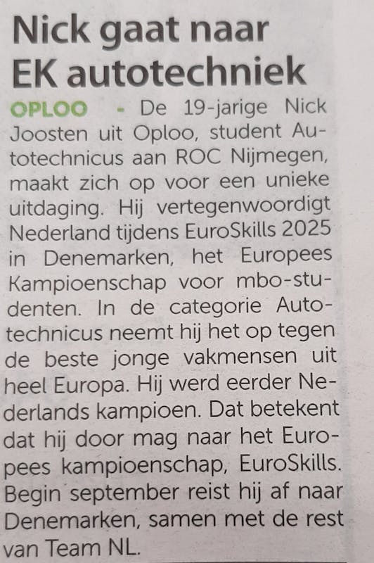 In de Boxmeerse Krant (uitgave week 25 - 2025) lazen wij dat Nick Joosten uit Oploo Nederland zal vertegenwoordigen tijdens EuroSkills 2025 in Denemarken. Nick neemt daar deel aan het Europees kampioenschap Autotechniek.