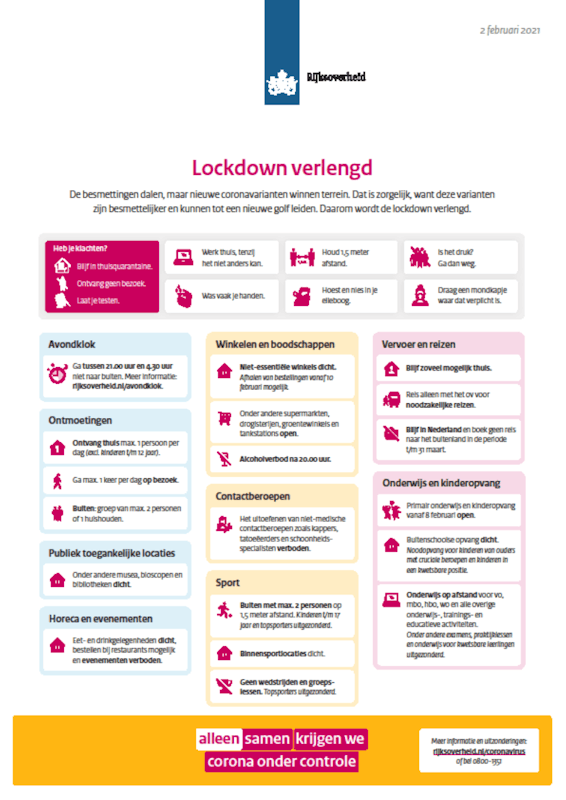 Samenvatting in beeld van de coronaregels zoals die gelden vanaf 10 februari 2021. In deze beeldsamenvatting staan de coronaregels uitgelegd.