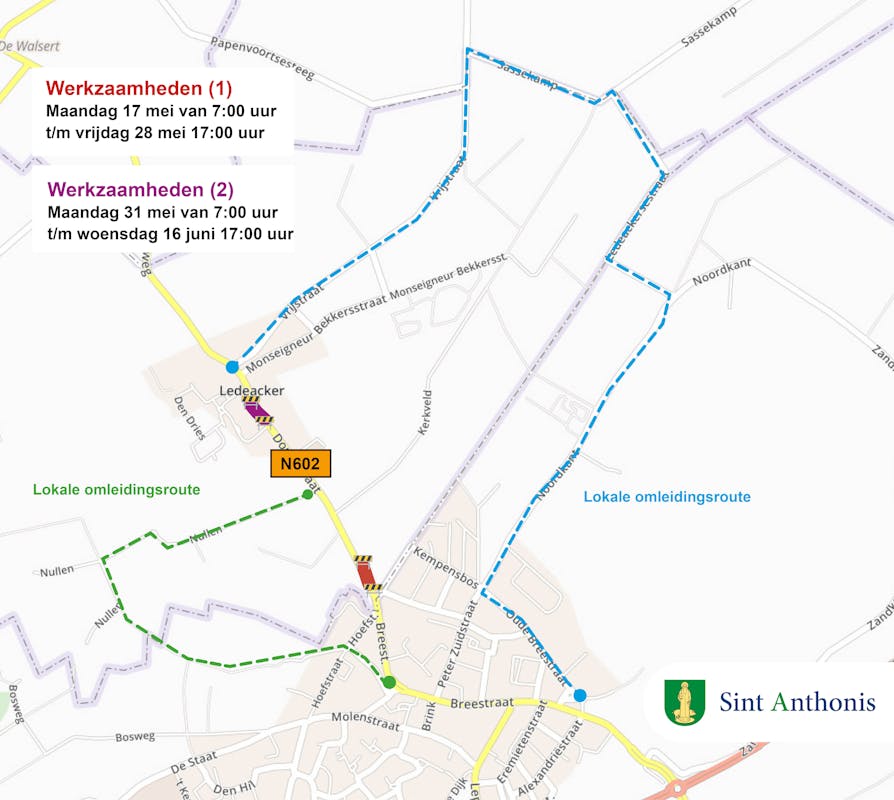 In verband met de werkzaamheden in de Dorpsstraat worden vanaf 17 mei tot en met 16 juni plaatselijke omleidingen (groen en blauw) ingesteld voor inwoners en bezoekers van Sint Anthonis en Ledeacker.