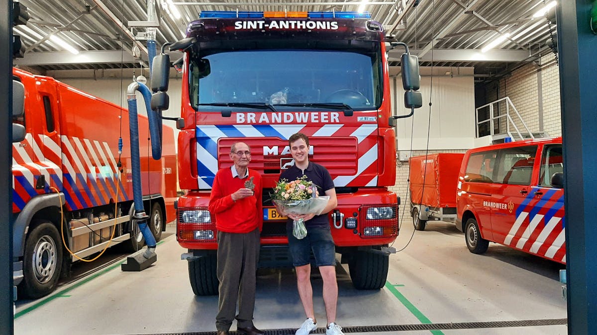 De oudste aanwezige oud-brandweerman is Wim van de Mortel, bijna 90 jaar oud en de jongste is Bono Arts, 23 jaar oud. Aan hen worden symbolisch de duim en de bloemen overhandigd. Wim is samen met Wiel van Dijk gestart. Wiel is 40 jaar lid van het korps geweest. Ze vertelden dat het er vroeger heel anders aan toe ging dan tegenwoordig. "Bij een auto-ongeluk werden de deuren opengebroken met bandafnemers. Met 55 jaar moesten we stoppen. Nu is de techniek en leeftijdsgrens heel anders en kan men na een jaarlijkse keuring tot een latere leeftijd bij de brandweer blijven." Postcommandant Jan Poels geeft een rondleiding door de pas verbouwde kazerne. Deze is volledig uitgerust met de nieuwste technologieën, zodat er zo snel mogelijk kan worden uitgerukt. Het korps bestaat nu uit 19 actieve leden die allen een tweejarige opleiding hebben gehad en wekelijks oefenen. Heb je interesse? Nieuwe leden blijven welkom. Lid zijn van de brandweer is een spannende, ontspannende bezigheid, waarbij de maatschappelijke betrokkenheid heel belangrijk gevonden wordt. De brandweerlieden hebben deze dikke duim meer dan verdiend omdat ze altijd klaar staan voor iedereen, vooral wanneer elke seconde telt.