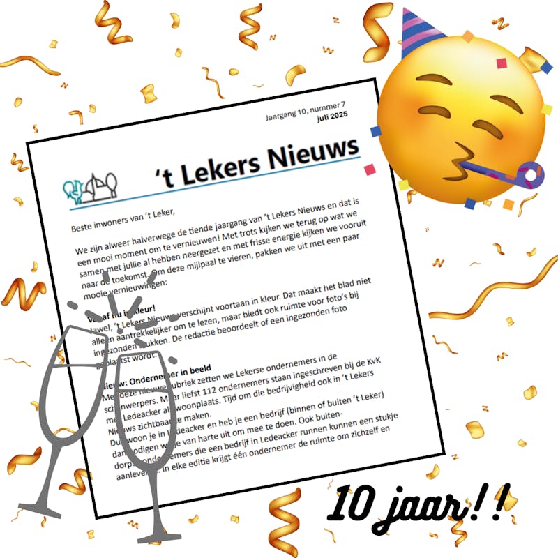 Wat een mijlpaal: we zitten alweer halverwege het tiende jaar van ’t Lekers Nieuws! Een prachtig moment om even stil te staan én vooruit te kijken. We zijn ontzettend trots op wat we samen met jullie hebben bereikt. Dankzij jullie betrokkenheid is ’t Lekers Nieuws uitgegroeid tot een blad dat écht leeft in Ledeacker.