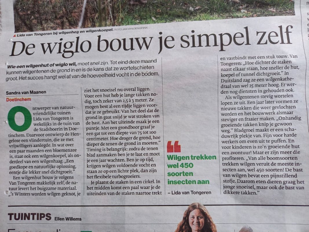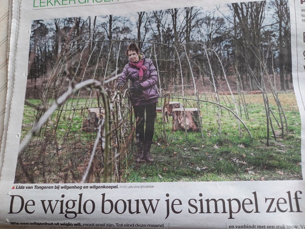 In de Gelderlander stond onlangs een interessant artikel over het bouwen van een Wiglo. Een wiglo is een Iglo gemaakt van gesnoeide wilgentakken. Je gebruikt kale levende wilgentenen zonder wortel, steekt ze diep in de grond, vlecht ze door mekaar in de vorm van een Iglo en in de lente begint alles te wortelen en te schieten en heb je een levende groene hut!
