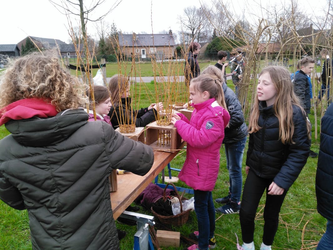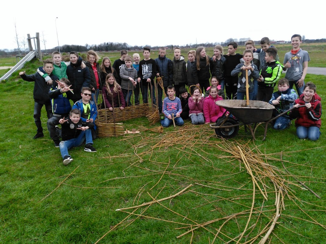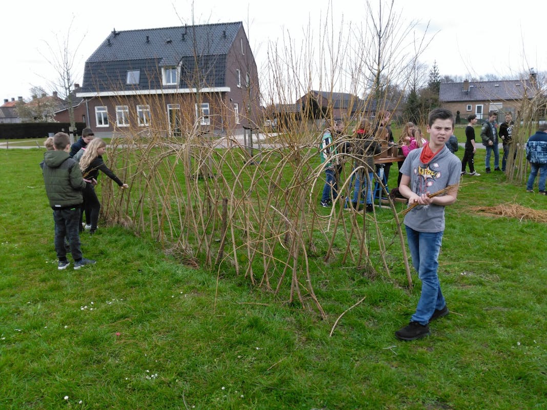 In Vortum hebben we precies zo gedaan en dat is inmiddels een forse wilgenhut geworden waar de kinderen zuinig op zijn want zij hebben het zelf gemaakt en onderhouden Zie de foto, waarbij de takken een muur en dak vormen Van het jaarlijks snoeien kun je de wilgentakken gebruiken om mandjes mee te vlechten of een huisje te bouwen etc.