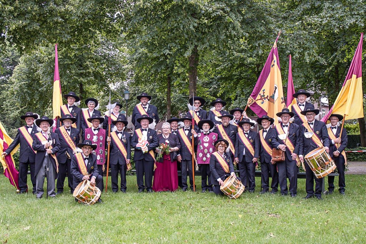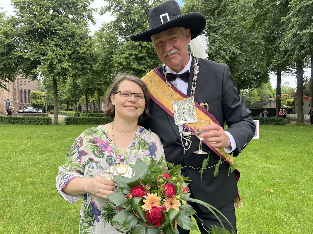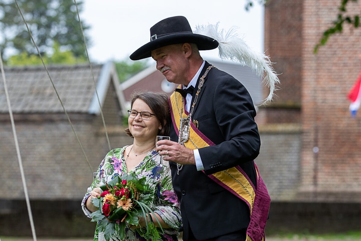 Na slechts 1 uur schieten en 34 schoten viel de vogel al naar beneden; nooit eerder waren zo weinig schoten nodig om te bepalen wie onze gildekoning werd. Op de foto staat Ton samen met zijn vrouw en koningin Maria.