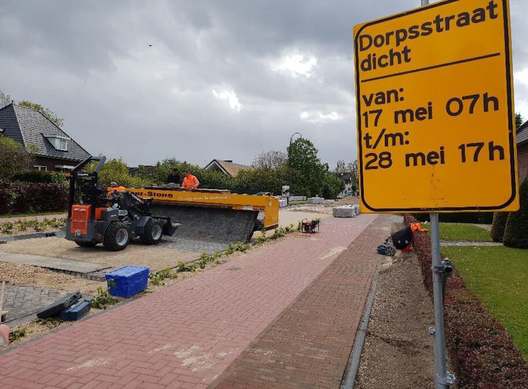 Sinds 17 mei zijn de stratenmakers aan de slag in het eerste stuk van de Dorpsstraat in Ledeacker. Afgelopen week werden de klinkers uit de rijbaan gehaald en keurig opgestapeld. Vervolgens werd vanaf de plantbak een begin gemaakt met het afvlakken en aftrillen van de ondergrond en het aanbrengen van een laag geel zand. Vrijdag kwam de Tiger-Stone in actie, om de klinkers strak in het gelid te leggen. Na de Pinksterdagen wordt dit doorgetrokken tot aan de afslag Ledeackersestraat.