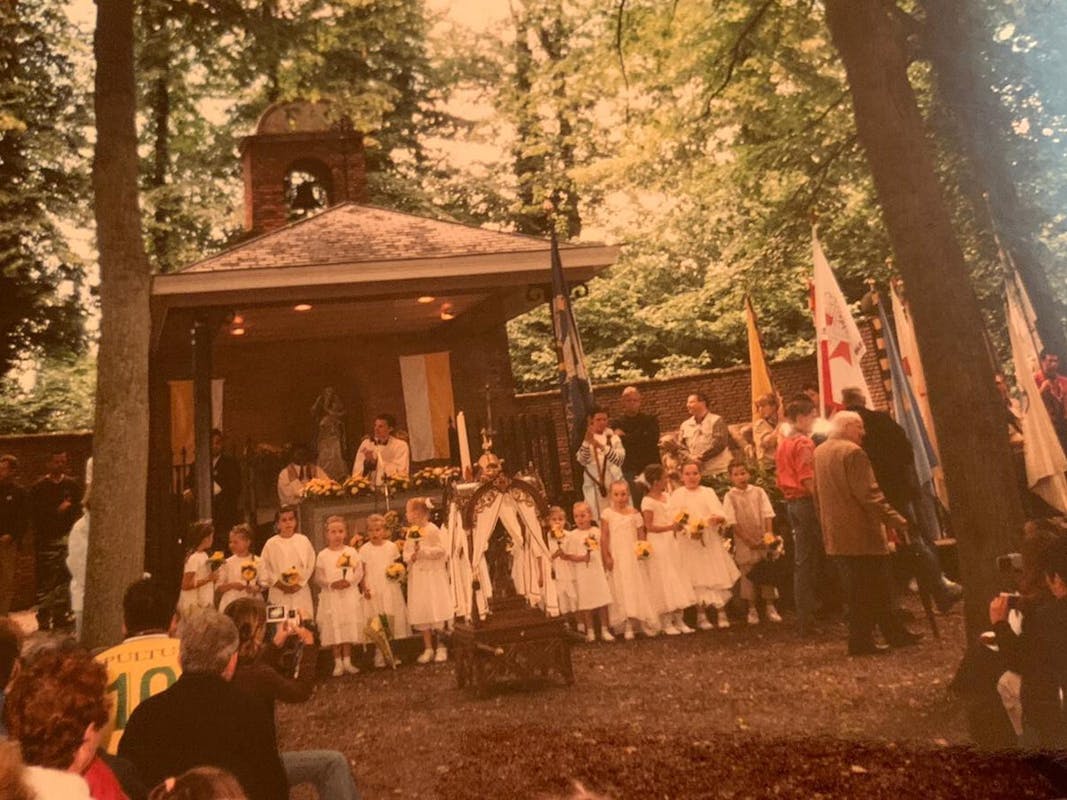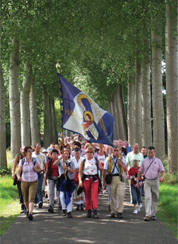 Op zaterdagmorgen om 04.30 loopt de wekker af. Dat is vroeg en ……het zou weleens heel warm kunnen worden. In de schemering van de Stippelberg even op de rem “want wij steken zo maar over”. Het loopt goed af. Het plein bij de kerk begint langzamerhand vol te stromen. Met zus Ans en haar twee vriendinnen vormen wij een groepje. Eerst handen schudden met pastoor/deken Van der Sluis die nu in deze parochie werkzaam is. Voor hem is dit gebeuren een absolute primeur. Mensen begroeten elkaar uitbundig, blij dat die ander ook weer meeloopt. Velen steken eerst een kaars aan achter in de kerk: succesvolle tocht! Het geluid van talloze huifkarren en briesende paarden overstemt bijna de oefenende muzikanten.