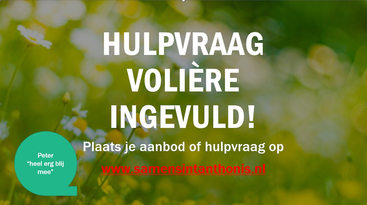 Wij wonen nog niet zolang in Sint Anthonis, en vanwege mijn gezondheid had ik hulp nodig bij het opbouwen van de volière. Iemand attendeerde mij op het online Dorpsplein samensintanhonis.nl. Ik heb toen een oproep geplaatst,