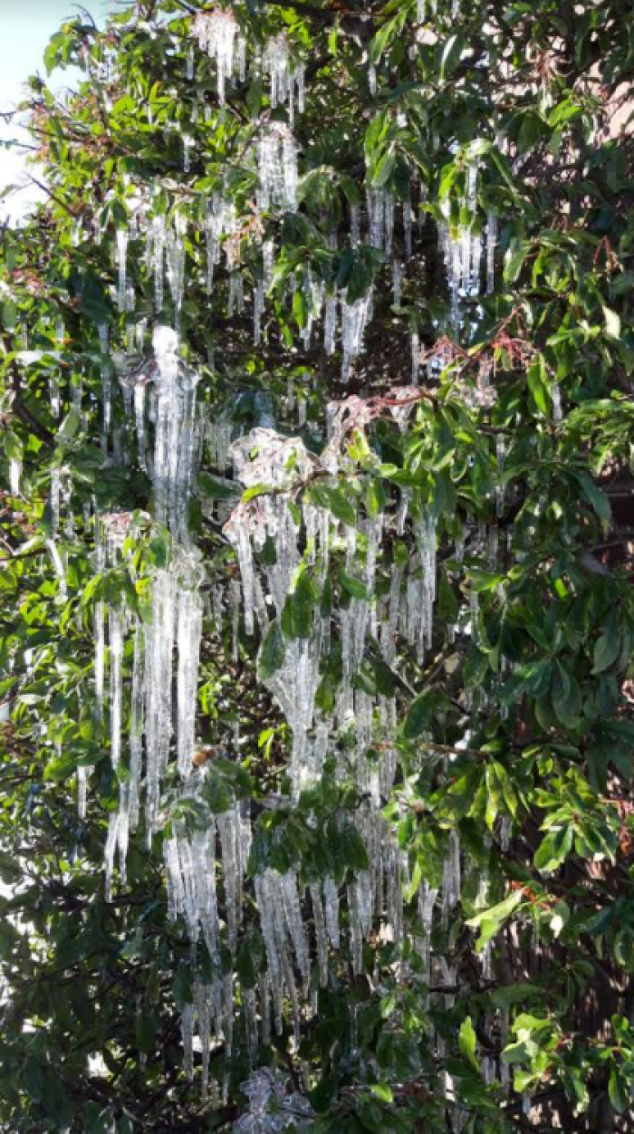 11 februari. Peter Bindels. "IJspegels" in onze bessenstruik, door een lekkende dakgoot.