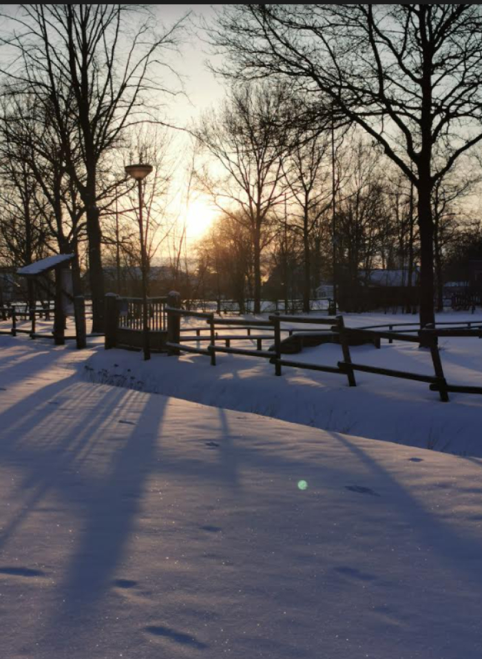 Marieke Rongen, "Op wintersport in Sint Anthonis" In de ochtend van de eerste sneeuwval. Iedereen op pad met de slee door het gure winterweer. Maar wat hebben we genoten! Foto is gemaakt op het paadje richting DSV