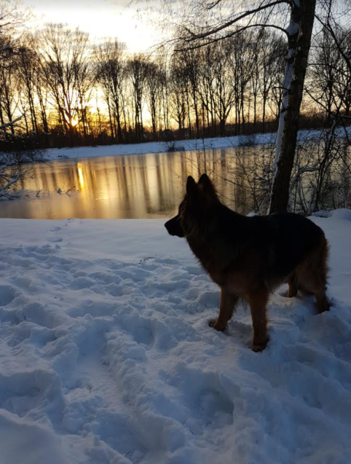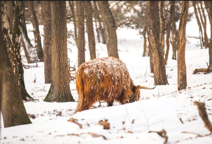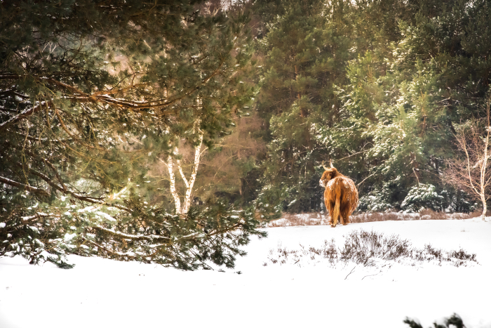 Marieke Rongen. Deze kwam ik tegen tijdens een wandeling in de Staatsbossen. In eerste instantie stond ze alleen, op zoek naar eten met haar kop onder de sneeuw te woelen. Later kwam ik ze weer tegen op de hei onder loeiend geluid op zoek naar de rest van de kudde. Prachtig hoe ze in groot tempo door de sneeuw heen klost en de groep weer terug vond.