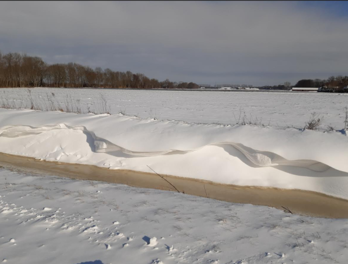 De foto is opgebouwd uit verschillende lagen, voorgrond, beekje, sneeuwduin, landbouwgrond, bomen en een boerderij en lucht. Hij heeft vooral de karakteristieke sneeuwduinen die tijdens de sneeuwval en wind ontstonden in beeld gebracht.