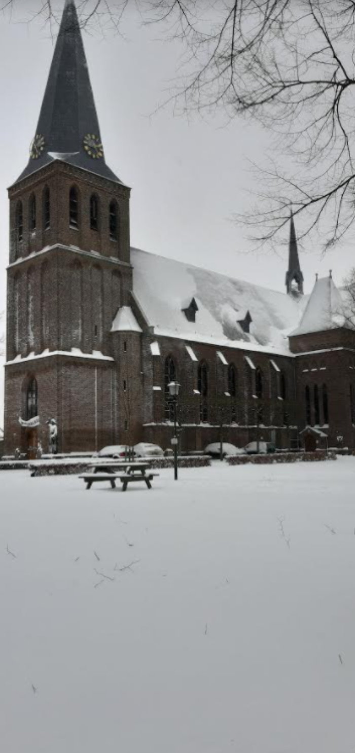Is de foto van de kerk in St. Tunnis die mooi in de sneeuwrijke omgeving staat. De kerk staat er helemaal op (met uitzondering van de spits). Volgende keer iets je camera of telefoon naar boven richten, dan staat de spits er ook op, want er is voldoende ruimte aan de onderkant.