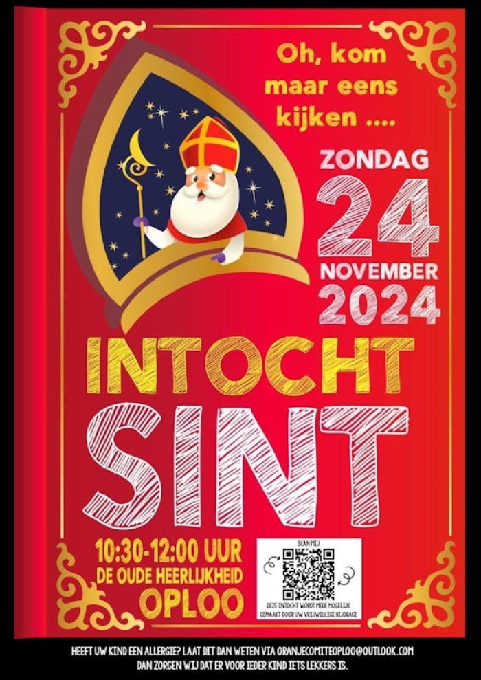 Op zondag 24 november heten we de Sint en zijn pieten welkom! van 10.30 tot 12.00 uur kun je hem persoonlijk ontmoeten in de Oude Heerlijkheid.