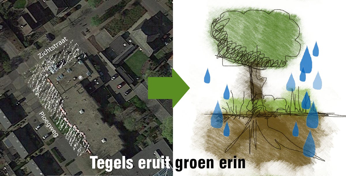 Op de hoek van Zichtstraat en Ploegweg ligt een groot verhard plein. Het is een stenige massa die niet uitdaagt om te verblijven. Dit vond ook initiatiefnemer Tijs van de Hulsbeek en Kees Jozephs. Hij heeft een start gemaakt om dit plein klimaatproof te maken. Doe je mee?